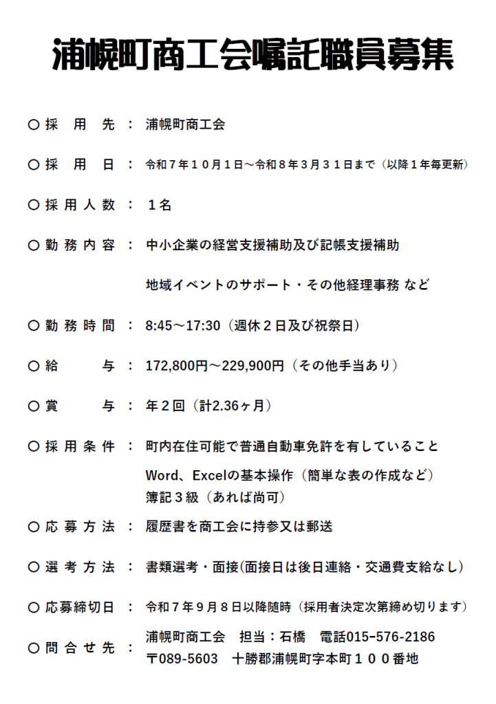 2025年9月18日 / 最終更新日時 : 2025年9月18日 小倉頌平 商工会からのお知らせ 嘱託職員募集のお知らせ 浦幌町商工会で働く嘱託職員を募集します。 詳細は貼付してある募集チラシをご確認ください。
