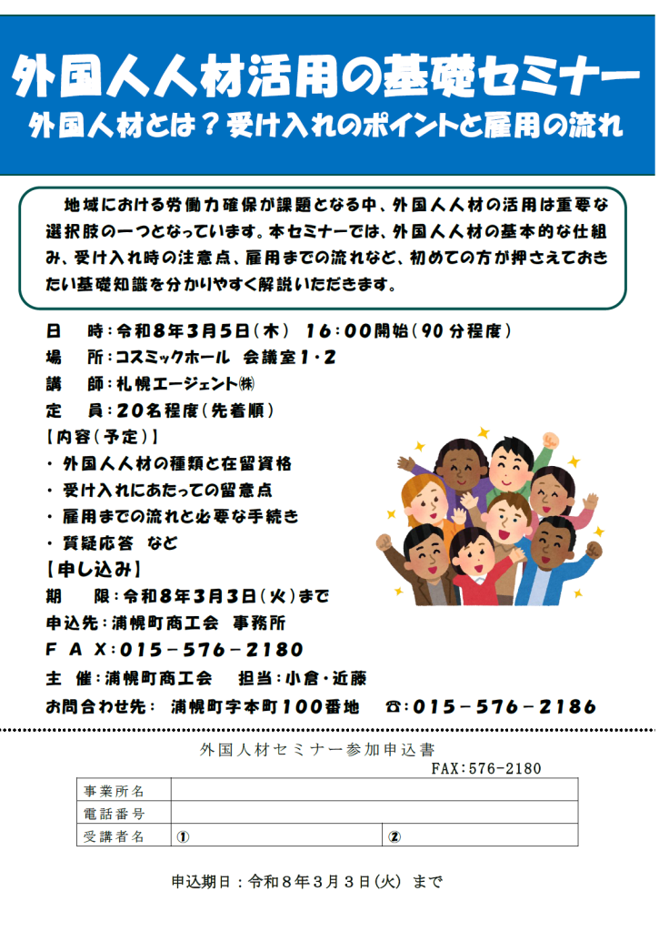 2026年2月24日 / 最終更新日時 : 2026年2月24日 小倉頌平 商工会からのお知らせ 外国人人材活用の基礎セミナー開催 3月5日(木)午後4時より、コスミックホールにて外国人人材の活用に関するセミナーを開催します。 参加申し込みは3月3日(火)までとなっております。 詳細は添付の資料をご確認ください。